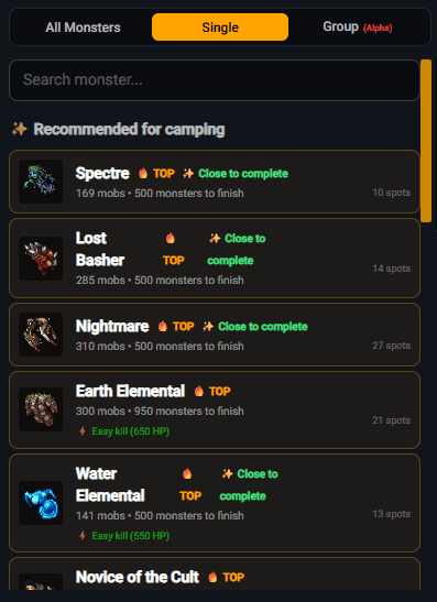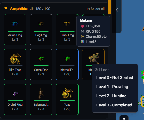 We've combined the Bestiary with our Spawn Map, creating a smart system that analyzes your progress and suggests the quickest creatures to complete next, maximizing your charm point efficiency.