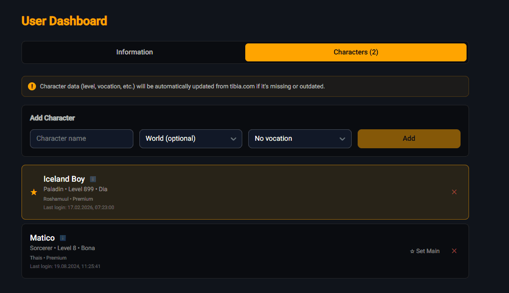 To use the Bestiary Tracker, start by logging in with your Discord account — you'll find the login button in the sidebar menu at the bottom of the screen. Once logged in, head to your User Dashboard and add your characters. Their data — including level, vocation, residence, and last login — will be automatically updated every 7 days directly from tibia.com. After that, you can quickly switch between your characters from the dropdown at the top of the page.![]()