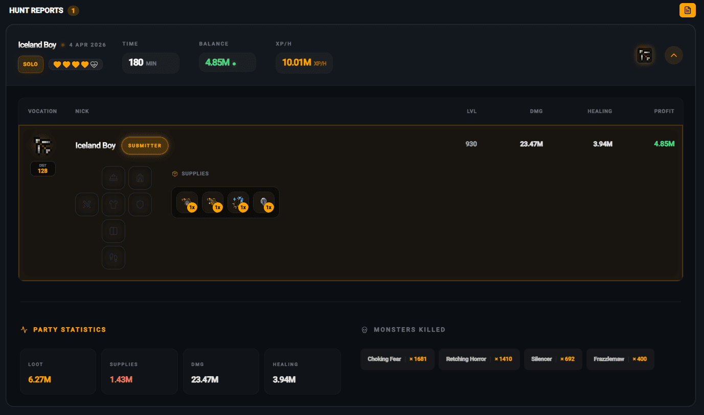 We're excited to introduce a brand new feature — Hunt Reports! Every logged-in user with a linked Tibia character can now submit their own hunt session data directly on any spawn page. Your reports help us continuously improve the quality of data we provide — and once reviewed by an admin, they become publicly visible to the entire community!