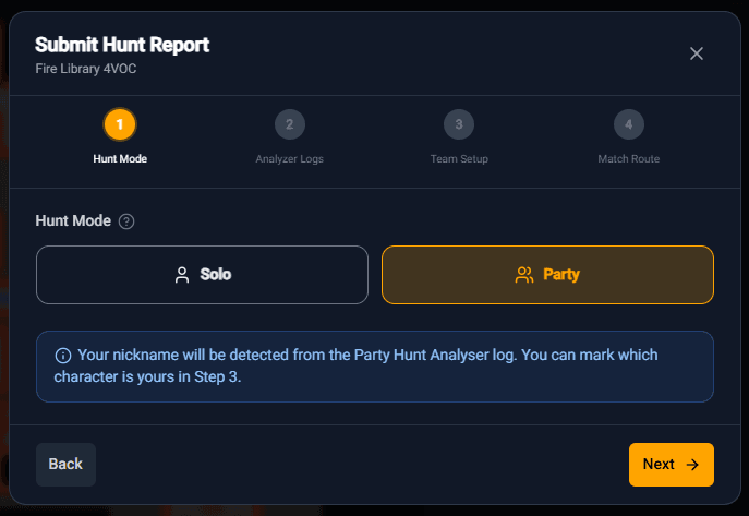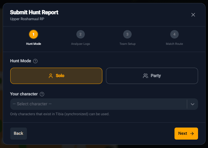 Select whether your session was Solo or Party, then pick your character from the dropdown. Only characters synchronized with tibia.com are available. In Party mode, your nickname will be automatically detected from the Party Hunt Analyser log — you'll confirm which character is yours in Step 3.