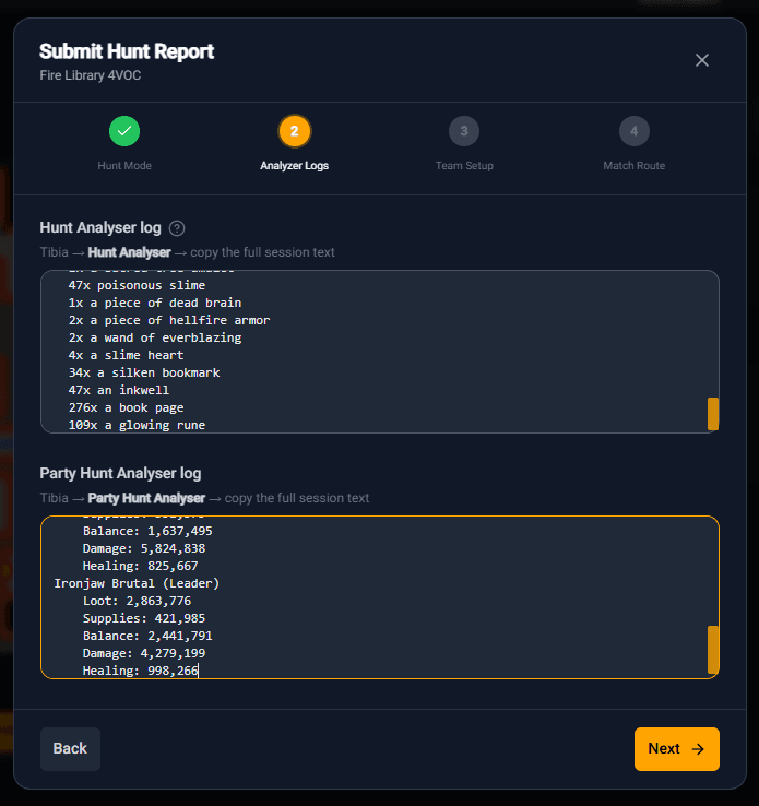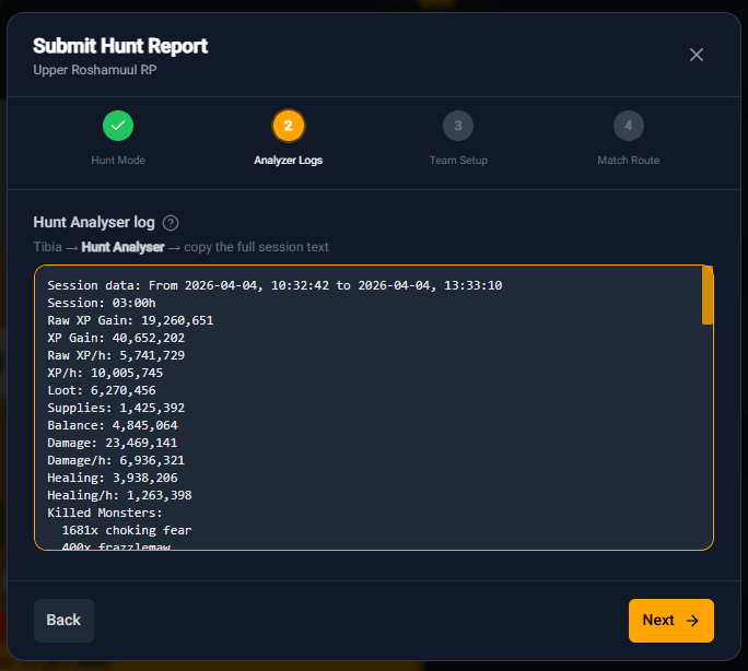Open Tibia → Hunt Analyser, copy the full session text and paste it into the provided field. For Party hunts, paste both the Hunt Analyser log and the Party Hunt Analyser log — both are required so the system can correctly attribute stats to each team member. The system will automatically parse all key stats — XP/h, loot, balance, damage, healing and killed monsters.