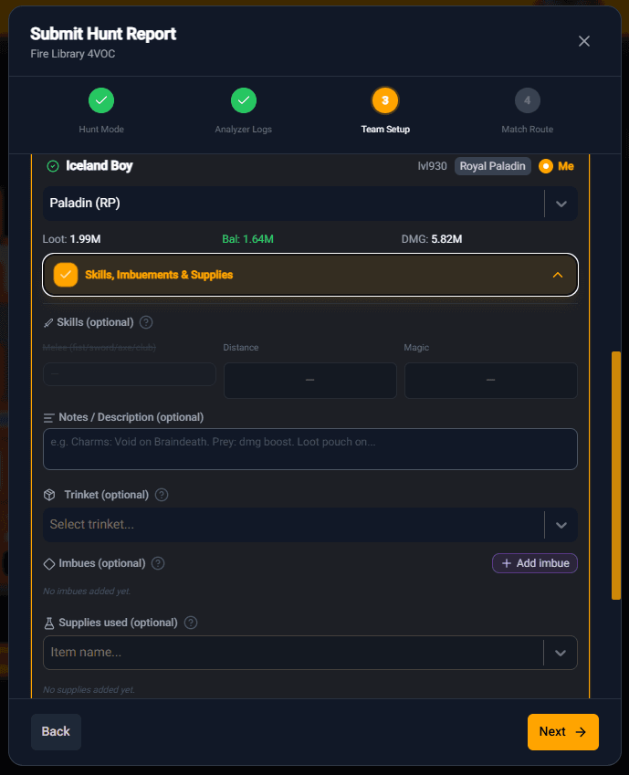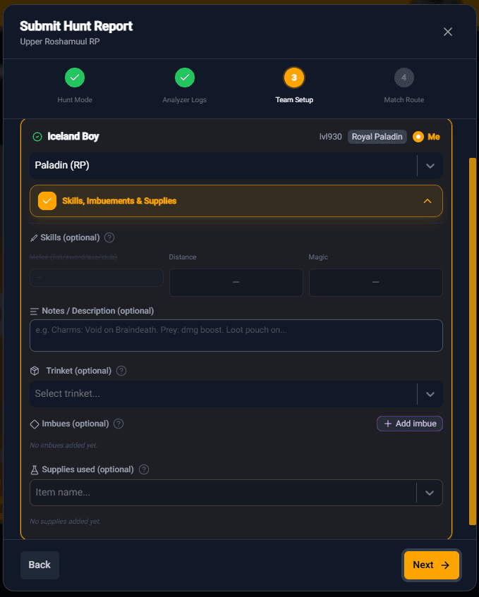 Review your character(s) detected from the log. For each team member you can optionally fill in: Skills (melee/distance/magic), Notes & Description (e.g. charms, prey, boost), Trinket, Imbues and Supplies used. The more details you provide, the more useful your report will be to others!![]()