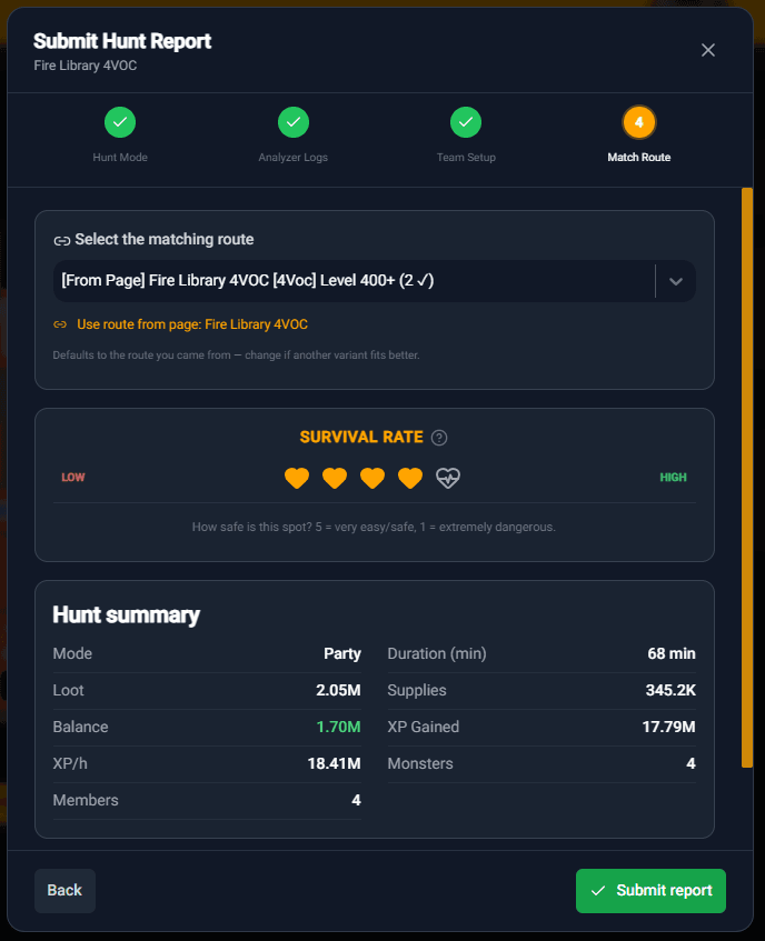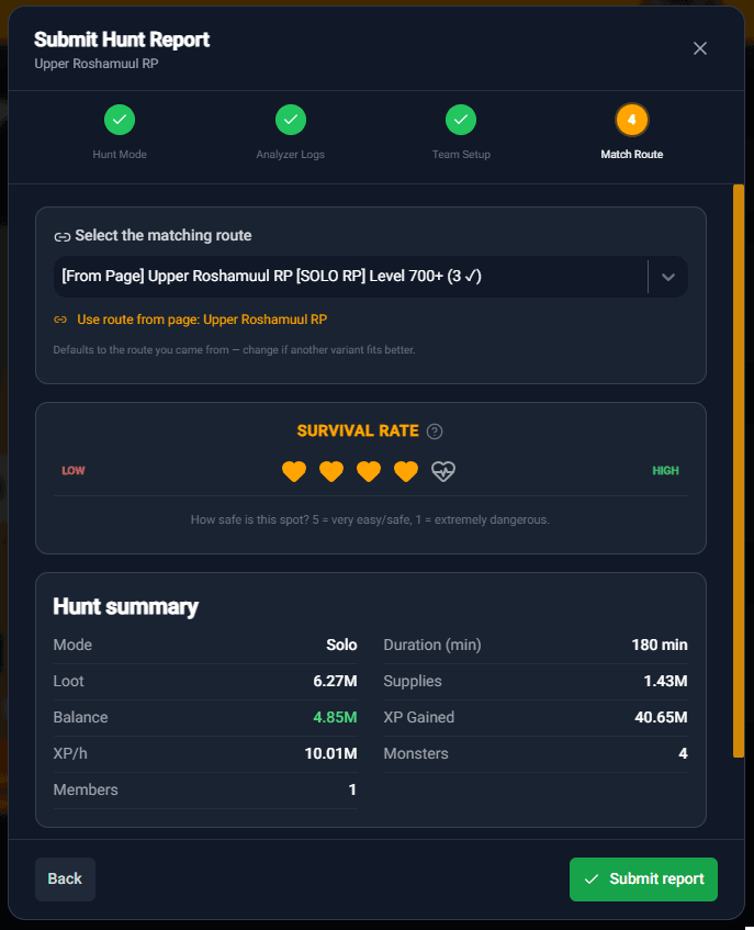 Select the matching route (it defaults to the one you came from), rate the Survival Rate of the spot from 1 (extremely dangerous) to 5 (very safe), and review your full Hunt Summary — mode, duration, loot, balance, XP/h and monsters killed. Everything looks good? Hit Submit report!